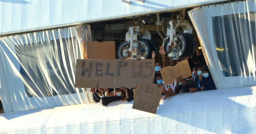 I migranti a bordo della Geo Barents, bloccati nel porto di Catania da ieri sera, hanno esposto dalla nave alcuni cartelli con scritto: “Help us”. Le condizioni a bordo stanno peggiorando per le delicate condizioni psicologiche delle persone ma anche per la precaria situazione igienico-sanitaria.